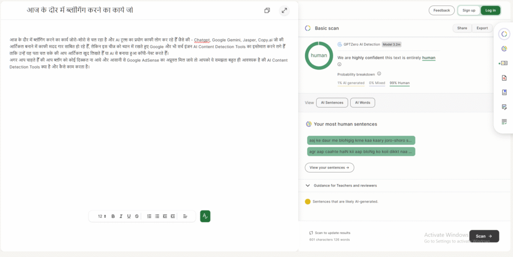 जब आप किसी भी आर्टिकल के पैराग्राफ को AI Content Detection Tools के अंदर चेक करने के लिए डालते हैं तो AI Content Detection Tools आपके लिखें पोस्ट में, लिखने के तरीके, शब्दों का प्रयोग, वाक्य के संरचना को स्कैन करता है और उसका रिजल्ट दिखता है।