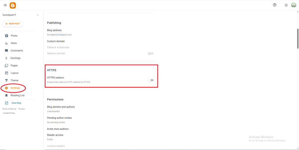 Blogger में Left sidebar में Settings पर क्लिक करें और नीचे स्क्रॉल करें। फिर आपको “HTTPS” section दिखेगा। HTTPS Availability को Yes पर सेट करें।