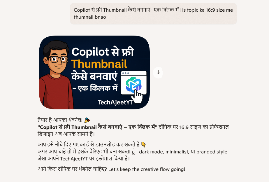 - अपने थंबनेल का टॉपिक लिखें। (“Copilot से फ्री Thumbnail कैसे बनवाएं- एक क्लिक में” इस टॉपिक का 16:9 साइज में थंबनेल बनाकर दो और कार्टून करैक्टर भी जोड़ना)